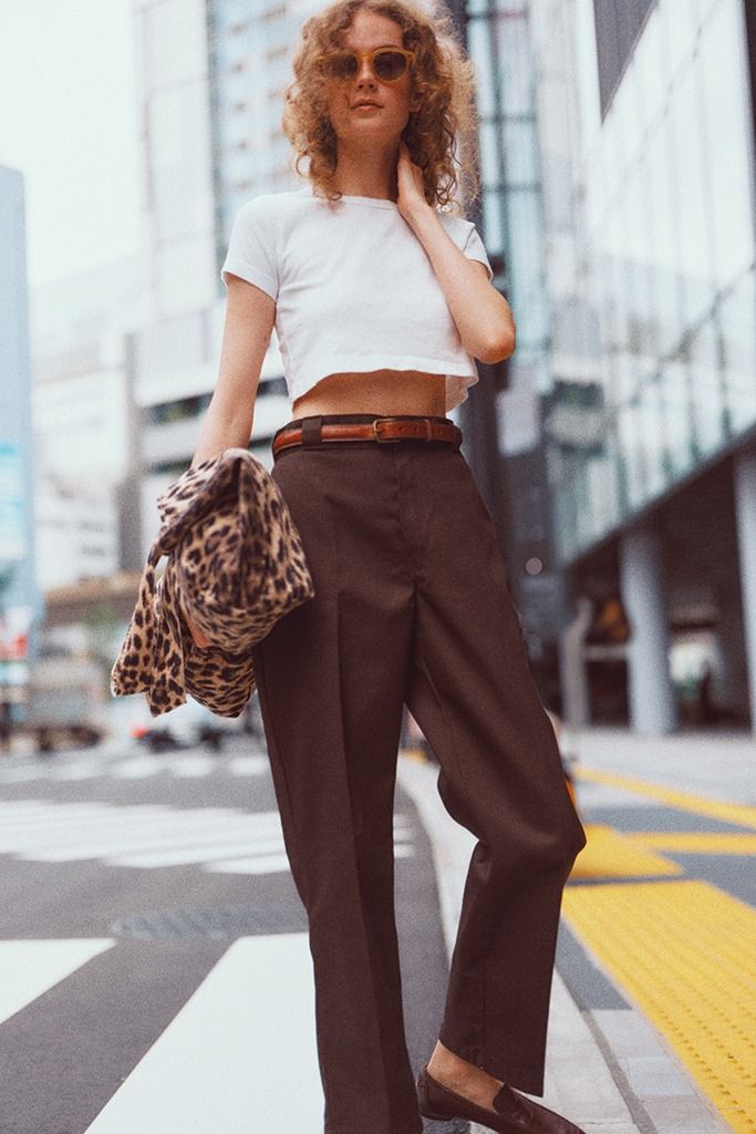白ショート丈Tシャツ 5,720円/SeaRoomlynn ブラウンチノパンツ 8,470円/ディッキーズ サングラス 50,600円/モスコット(モスコット トウキョウ) ベルト 14,300円/TORY LEATHER(メイデン・カンパニー) バッグ 19,800円/バウム・ウンド・ヘルガーテン(S&T) シューズ 33,000円/シーセイ(アイネックス)