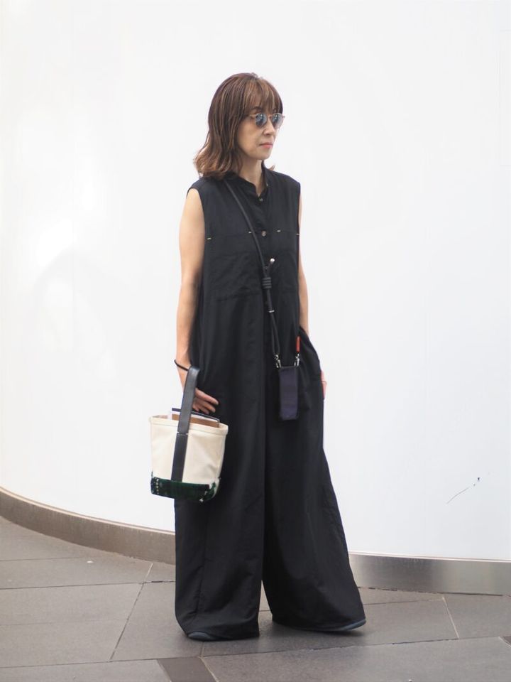 ゆったりしたリラックス感のあるシルエットながら、凛とした着こなしが叶う「ナゴンスタンス」のオールインワンは、稲葉さんのお気に入り。「夏は特に黒を選ぶことが多いので、私のワードローブには欠かせません。熱がこもりにくく、取り扱いも楽ちんです」