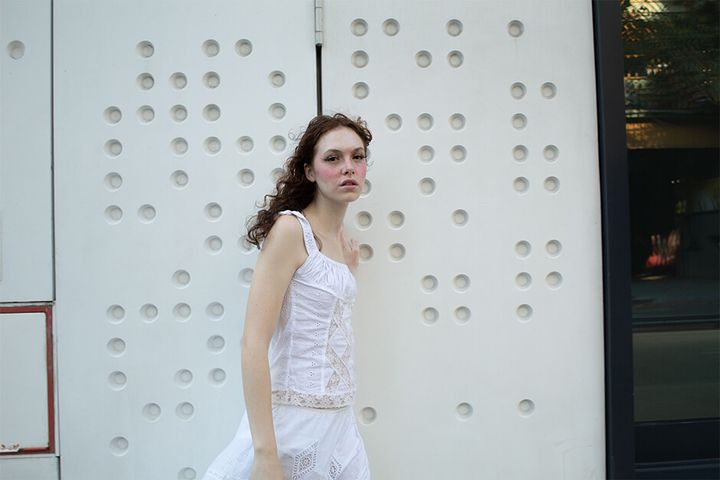 この感覚を表現するために私たちはメイクアップに力を入れ、日に焼けて甘く汗ばんだ肌に見えるようにしました。スタイリングも少女と環境のカメレオンのような調和の感覚を裏付けるために重要でした。