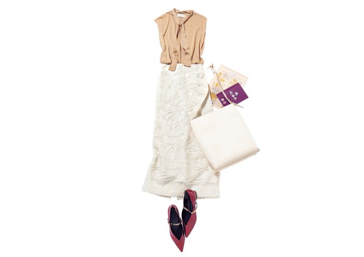 ノースリーブニット¥4,389/ ロペピクニック(ジュン) 刺繍タイトスカート¥20,900/マイストラーダ チェーン付きパンプス¥30,800/銀座かねまつ(銀座かねまつ6丁目本店) トートバッグ¥13,000/PLST