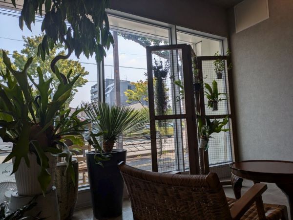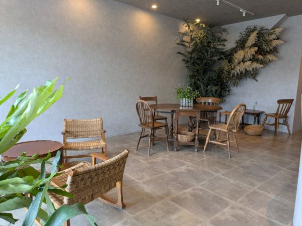 籐のテーブルセットがドライフラワーとマッチしていますね。カウンター席もあるので、混み合っている時に一人で訪れても安心です。