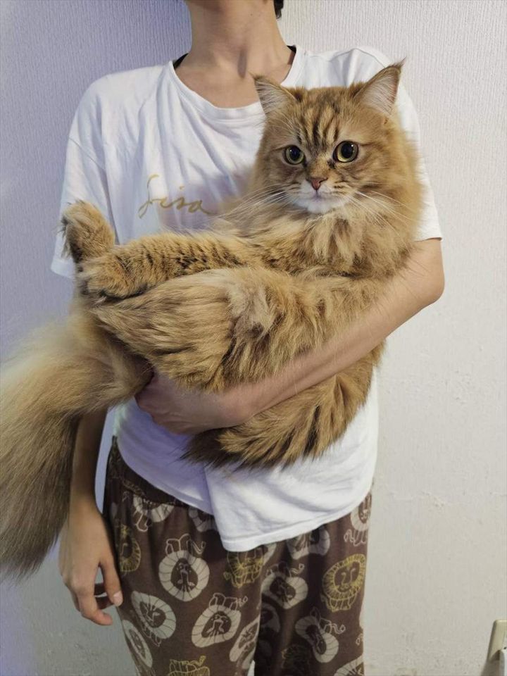 飼い主さんにだっこしてもらっているのは、サイベリアンの『からし』ちゃん。