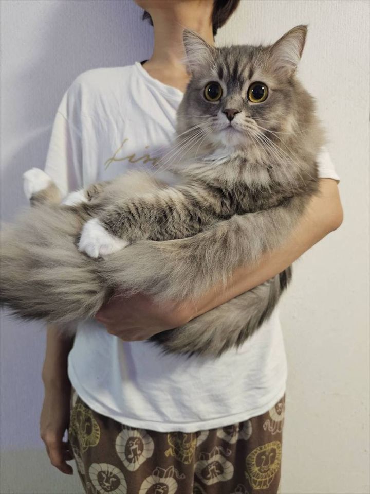 子猫の時期から抱っこされることに抵抗をいだいていなかったのだそう。 ちなみに、からしちゃんもわさびくんも体が大きいように見えますが、写真の撮り方や角度等の影響でそう見えるだけで、2匹ともサイベリアンの平均体重を下回っているそうですよ。