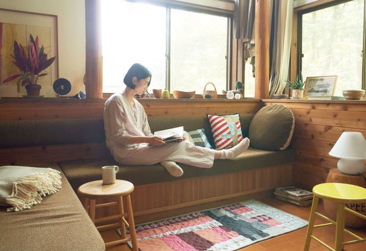 小さな住まいの居心地が良い理由の一つは、手の届く範囲すべてを自分好みのもので囲めるから。さらにお気に入りの〈マーガレット・ハウエル ハウスホールドグッズ〉のルームウェアを身に着ければ、いっそう心落ち着く時間に。リネンのニットカーディガンは柔らかな肌触りで、さらりと羽織れる一枚。シャツ生地のコットンパンツも軽くてはきやすく、ピンクの色合いに気分が安らぐ。カーディガン¥31,900、パンツ¥30,800(ともにマーガレット・ハウエル 03−5785−6445) 時計¥57,200(ヴィトラ 0120−924−725)クッション各¥38,500、ラグ¥77,000(以上アー・ぺー・セー キルト/アー・ぺー・セー カスタマーサービス 0120−500−990) その他スタイリスト私物