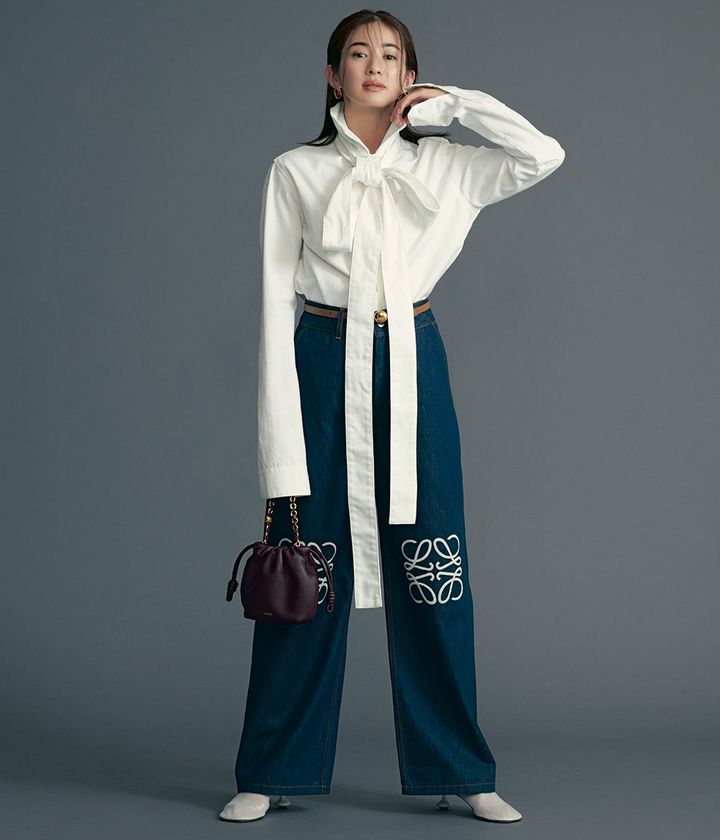 デニム地のボウタイシャツ×ビジュアル映えするデニム合わせで印象力アップ。デニムボウタイブラウス¥137,500デニムパンツ¥148,500バッグ¥394,900ミュール¥156,200ピアス¥96,800ベルト¥61,600(すべてロエベ/ロエベ ジャパン クライアントサービス)