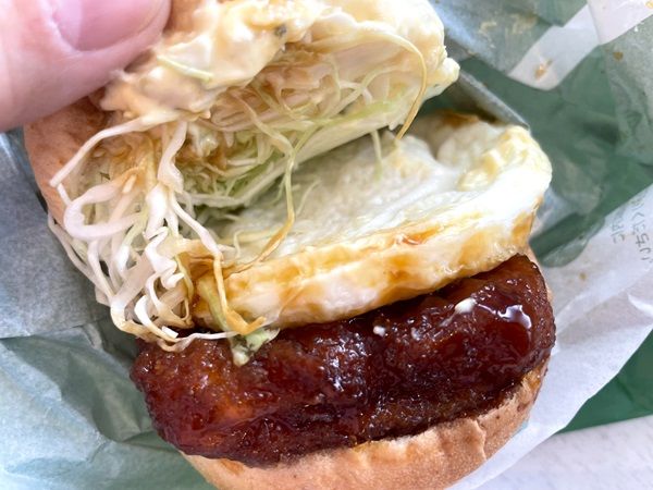テリヤキソースがたっぷり絡んだチキンカツに、目玉焼き風オムレツ、そして具沢山のタルタルソースと千切りキャベツが合わさったボリューム満点の月見バーガー。持ってみると厚みもすごいです。