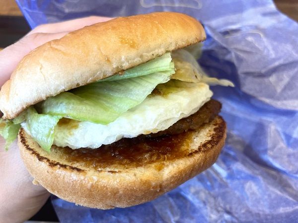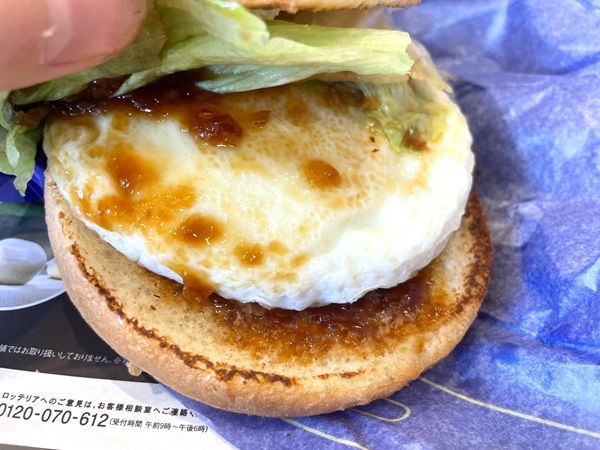 てりやきとたまごは合わないわけがない! 真ん中部分を頬張ると、中からは黄身がとろっと溢れ出しました。個人的に大好きなロッテリアのこってりとしたマヨネーズが、目玉焼きとてりやきとの相性抜群で最高でした。ふわふわで厚みのあるバンズとシャキシャキレタスも楽しめます。お肉、たまご、バンズ、レタスというシンプルな具材なので、スタンダードな月見バーガーが食べたい人にはおすすめ。