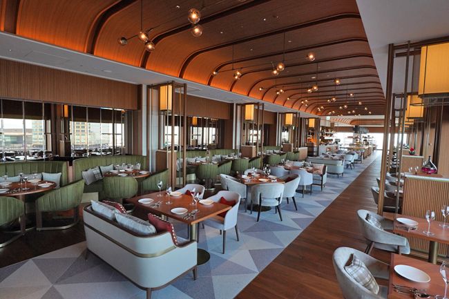 メインダイニングの「THE-MOMENT GRILL&DAINING」の内装は、豪華列車の食堂車をイメージ。”Farm to Table &Charcoal Grill”をテーマに、シェフが厳選した日本各地の食材や世界の素材を使った80種類以上のメニューをビュッフェスタイルで楽しむことができます。