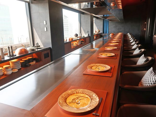 全長約12mのロングカウンターから、大阪の景色を一望できるのも素敵! 夜は、目の前に大阪の夜景が広がります。同店には個室もあるので、大切な人とのお祝いごとなどにもオススメ。