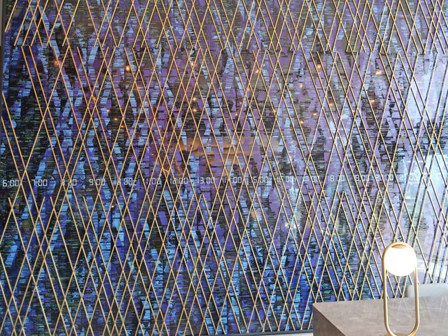 ダイヤグラムアート」(写真上)は、山陽新幹線の大阪ー小倉間のダイヤグラムをアートに昇華させたもの。よく見ると時刻なども表示されています。