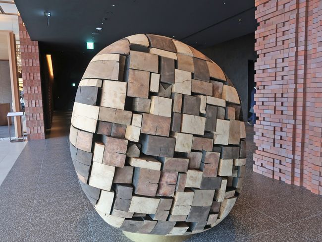 ロビーにある「ウェルカムエッグ」は、枕木の素材を使用し大阪環状線をイメージ。エッグの全高(1,874mm)は大阪駅開業の年と同じにするなど、こだわりの詰まったアートです。エッグの中に切符の形にカットされた木材があるので、ぜひ探してみてください。