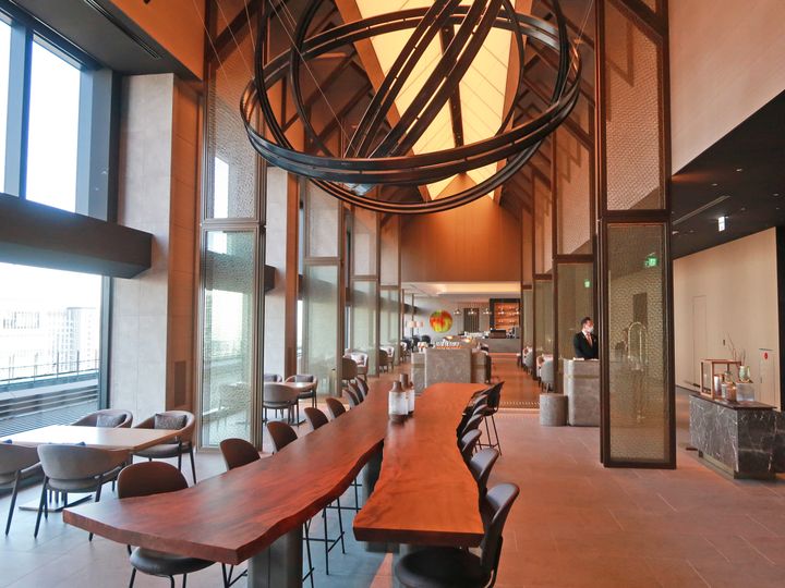 ロビーにあるラウンジ「THE LOBBY LOUNGE」は、初代大阪駅の切妻屋根をモチーフにした約10mの吹き抜けと、リングアート(写真上)が印象的。Xの形を模したテーブルは離合する「線路」を表しているなど、こんなところにも鉄道のスピリットがちりばめられています。
