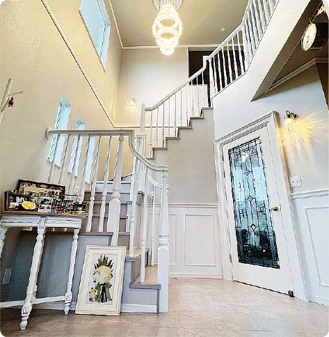 空調効率と音問題などを考えて、吹き抜けを作るのは玄関にしました。海外の城のような階段に憧れていたので、手すりや吹き抜けの照明はこだわって選びました。扉は輸入品でそろえ、回り縁も少し太めにしています。