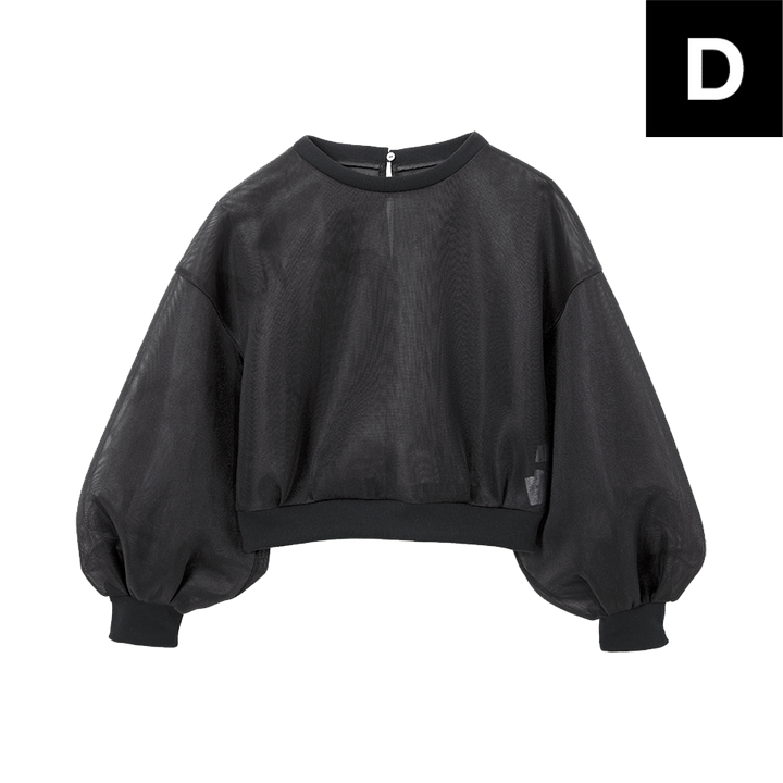 大人でもトライしやすい、ブラックのちょい透けトップス。クロップト丈とボリュームスリーブのバランスが絶妙で、ハイウエストデニムとの相性も抜群。¥19,910(アンクレイヴ ホワイト/アンクレイヴ)