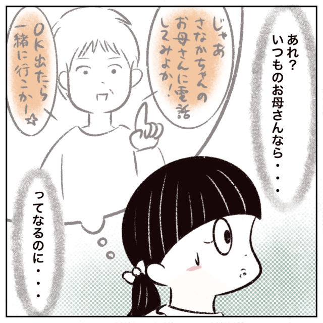 お母さんとさなかちゃんのやりとりを見ていたまるさんは「あれ?いつものお母さんなら・・『じゃあ、さなかちゃんのお母さんに電話してみよか!OK出たら一緒に行こかー』ってなるのに・・」いつもと違うお母さんの対応を不思議に思っていました。