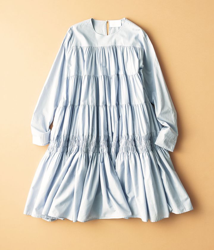 袖が細く淡いラベンダー色で、甘い中にもクールさがあるところが好き。秋は1枚で、冬はニットやジャケット、ブーツなどと重ねて楽しみたい。