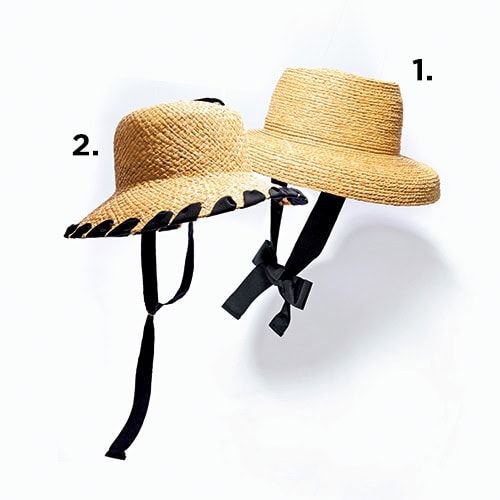 1.下に曲がったつばがファニーなラフィアハット。クラシカルな“C”のワンポイントと太いリボンがレディライク。¥15,400(カシラ/カシラ プレスルーム) 2.アップルパイの縁取りをイメージしたデザインがアクセント。ストラップはフックで引っかける簡単仕様。¥29,700(セイラ ミヤムラ/ススプレス)