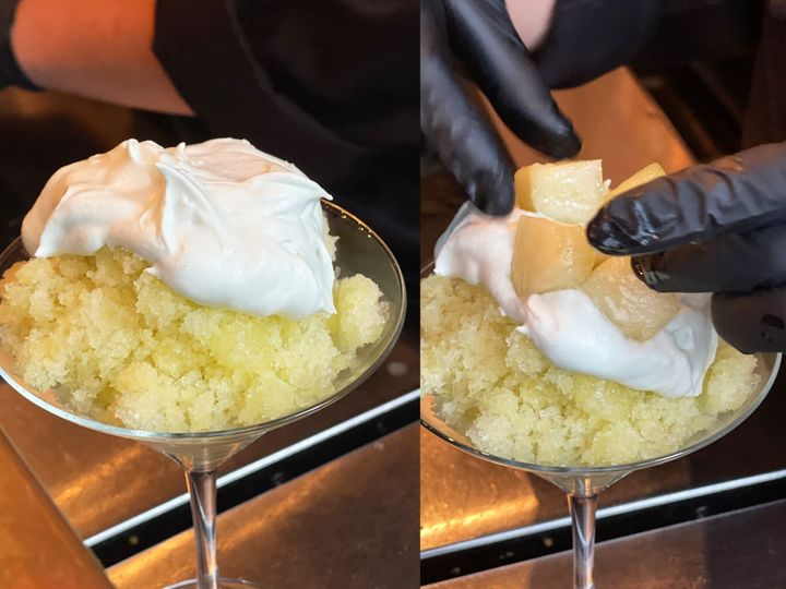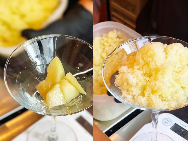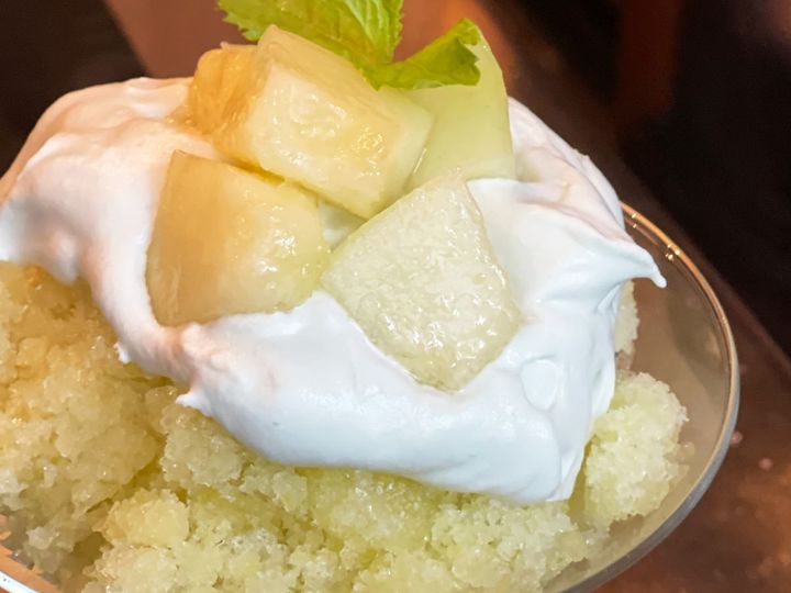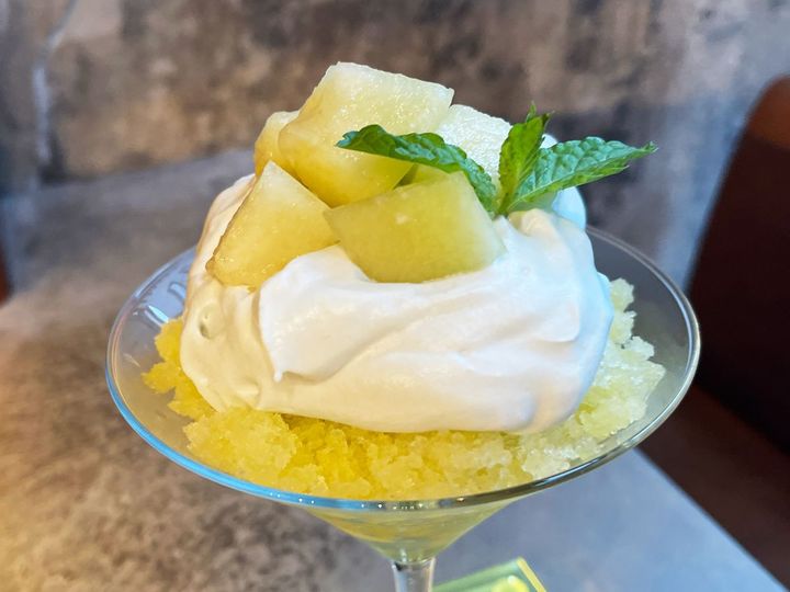 メロンを手早くカットして果肉を盛り付け、その上にメロンを凍らせて削った“かきごおらん”をこれでもかとトッピング。メロンの芳醇な香りを楽しむことができます。