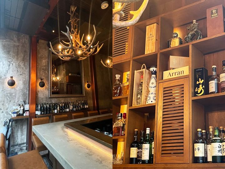 夜はバーを営業している店内だけあって、ラグジュアリーな雰囲気。棚にはシャンパンやワイン、ウィスキーなど有名なお酒が並んでいます。