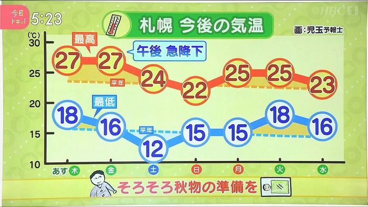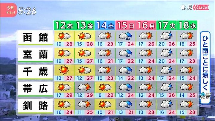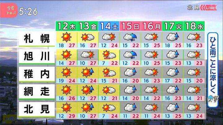 金曜は道北やオホーツク海側で通り雨があり、この雨が涼しい空気を連れてきます。土曜は晴れても25度に届きません。日曜と火曜は雨で、これからは一雨ごとに季節が秋へと進みそうです。