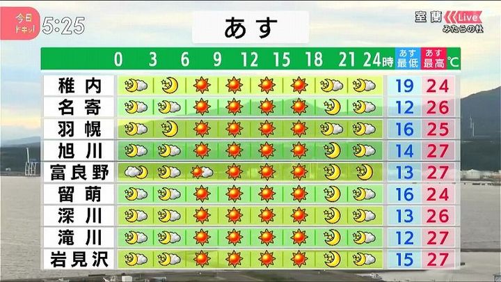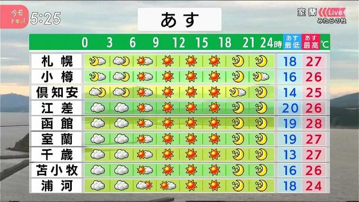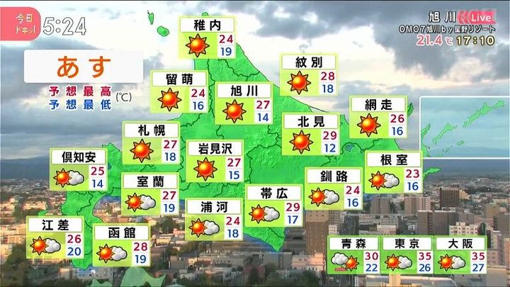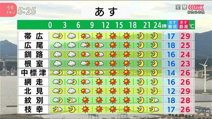 朝は広尾や根室など、太平洋側の海岸部で雲が広がりますが、午後を中心に各地でよく晴れるでしょう。北見は朝12度の日中29度。内陸では朝晩と日中の気温差が大きくなります。