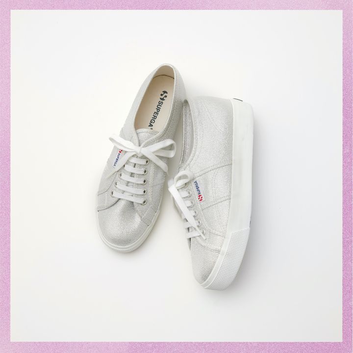 スペルガの人気アイテム、グリッターのようなラメスニーカーの厚底3cmソールモデル。白っぽくキラキラと細かく輝く素材なので、派手すぎず意外なほどに着こなしで取り入れやすい。
