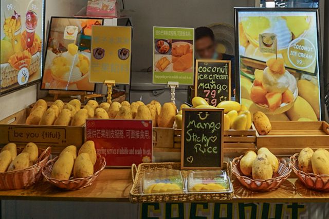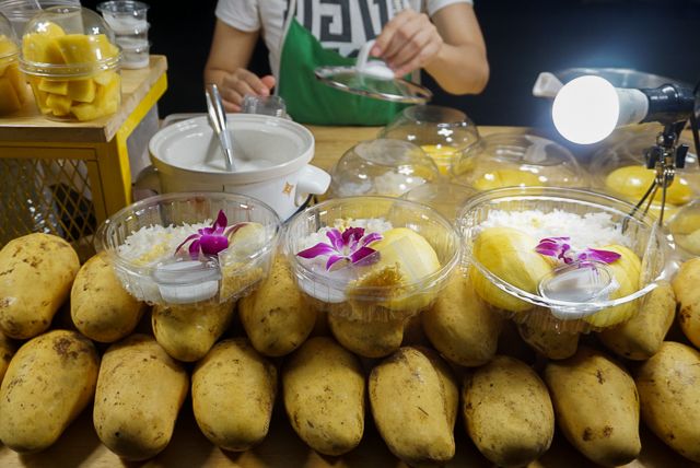 スイーツもたくさん並んでいます。こちらは「マンゴースティッキーライス」のお店。タイではマンゴーに餅米を組み合わせたデザートが定番です。