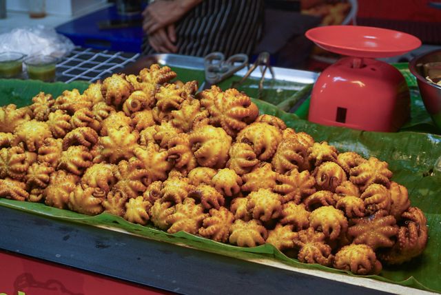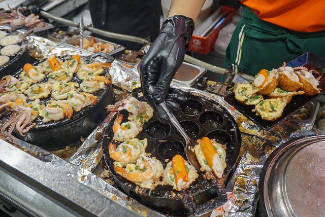 タイの伝統的なお菓子「カノム・クロック」のシーフード版。どことなく日本のたこ焼きに似ている気がします。
