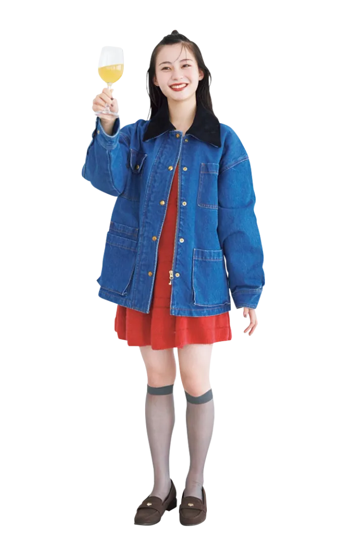 視線を集める赤ワンピに、レトロなブルージャケットをあわせてとことん華やかに。秋色ローファーを選んで足元まで抜かりなく!