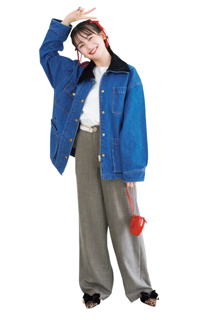 秋アウターはカジュアルにも女っぽくも振れるデニムジャケットをチョイス。濃青なら赤やピンクとの相性も◎。