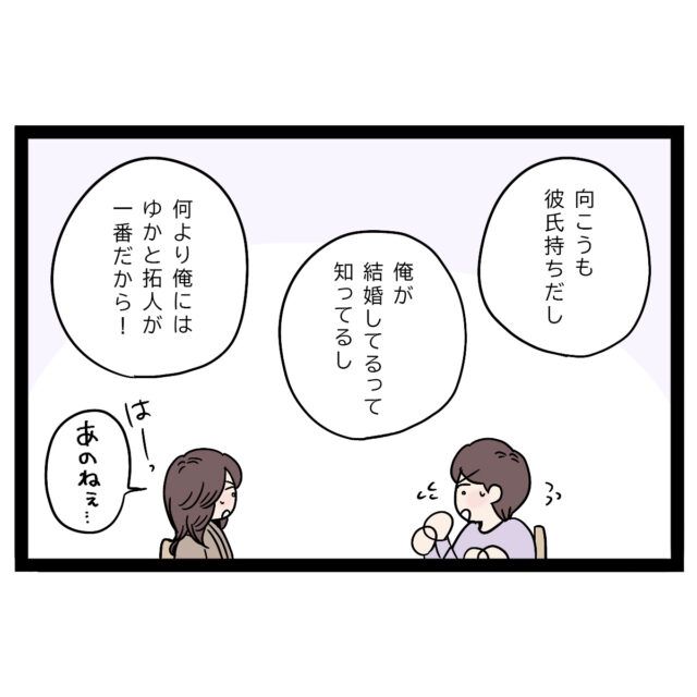 「向こうも彼氏持ちだし、俺が結婚してるって知ってるし、何より俺にはゆかと拓人が一番だから!」と言い切るまさひでさん、「はーっ・・あのねぇ・・」と雅美さんは呆れてため息をつきました。