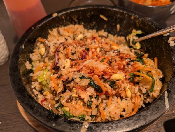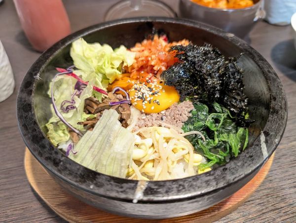 こちらもオススメ。韓国料理の定番「石焼きビビンバ」。注文の際に「ごはん多めで…♡」とお伝えすると、なんとも幸せなボリュームで提供されてきます。