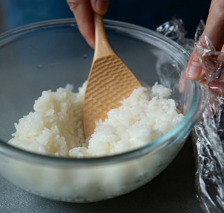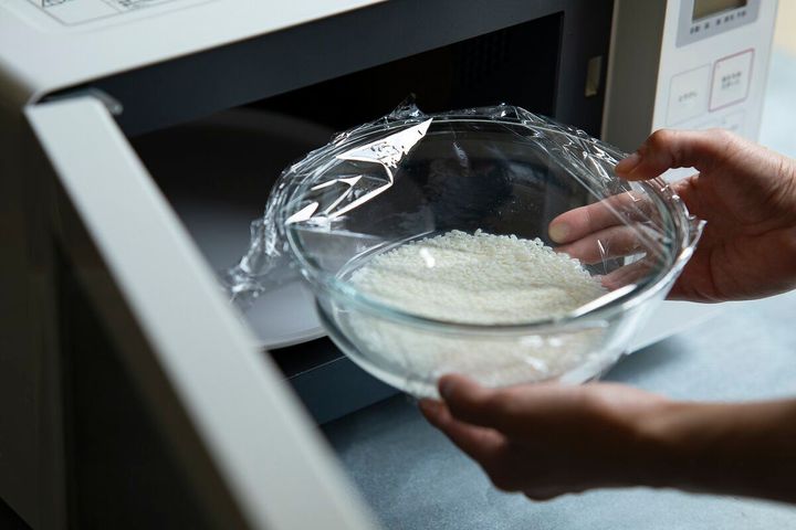 一度取り出して全体を混ぜ、再びふんわりとラップをかけて同様に3 分加熱する。取り出して全体を混ぜ、ラップをぴっちりとかけなおして5 分蒸らす。