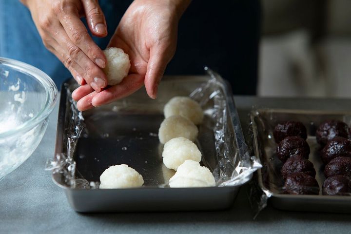 ラップを敷いたバット2 個に、手に水少々をつけながら、(4)と粒あんをそれぞれ8 等分に丸めてのせる。
