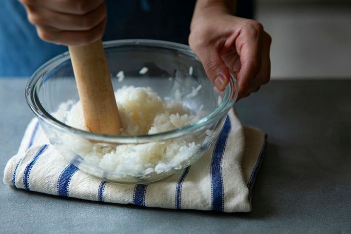 ラップをはずし、ボールの下にふきんなどを敷いて、水でぬらしたすりこ木で、ご飯粒が残る程度につく。