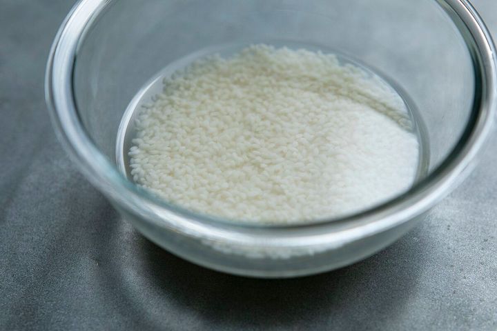 耐熱のボールにもち米を入れ、さっと洗ってたっぷりの水に30 分つける。