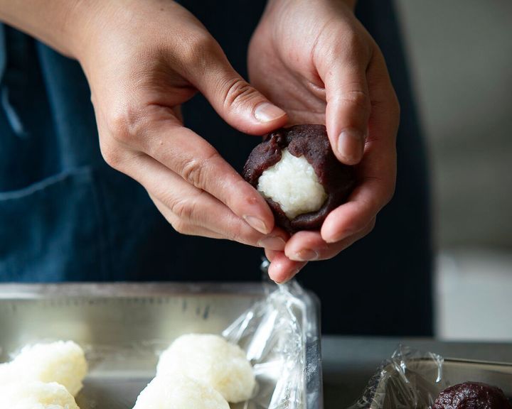 手のひらにあん1 個をのせて広げ、その上にご飯1個をのせる。まわりを持ち上げるようにして全体を包み、裏返して形を整える。残りも同様にして作る。