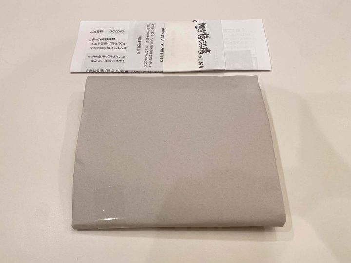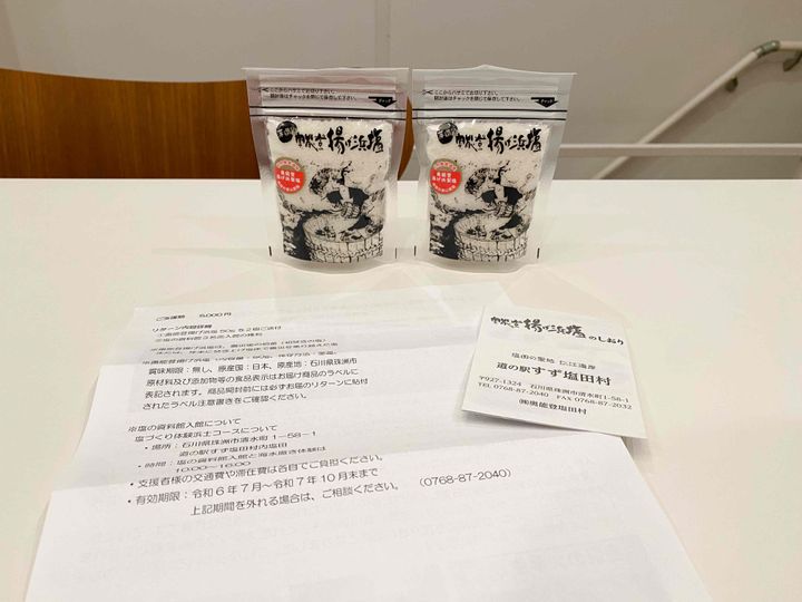 5,000円の支援のリターンとしていただいたのは、「奥能登揚げ浜塩50g(今年初釜の塩)」2個と、珠洲市にある「塩の資料館」3名までの入館権利です。