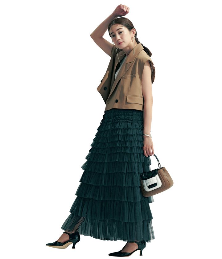 ダブルスタンダードクロージングの名品チュールスカートは広がりすぎない美シルエットと幅の異なるティアードデザインで華やかながらも大人な佇まい。重心を上げてくれるショート丈ジレでさらにスタイルアップを狙って。