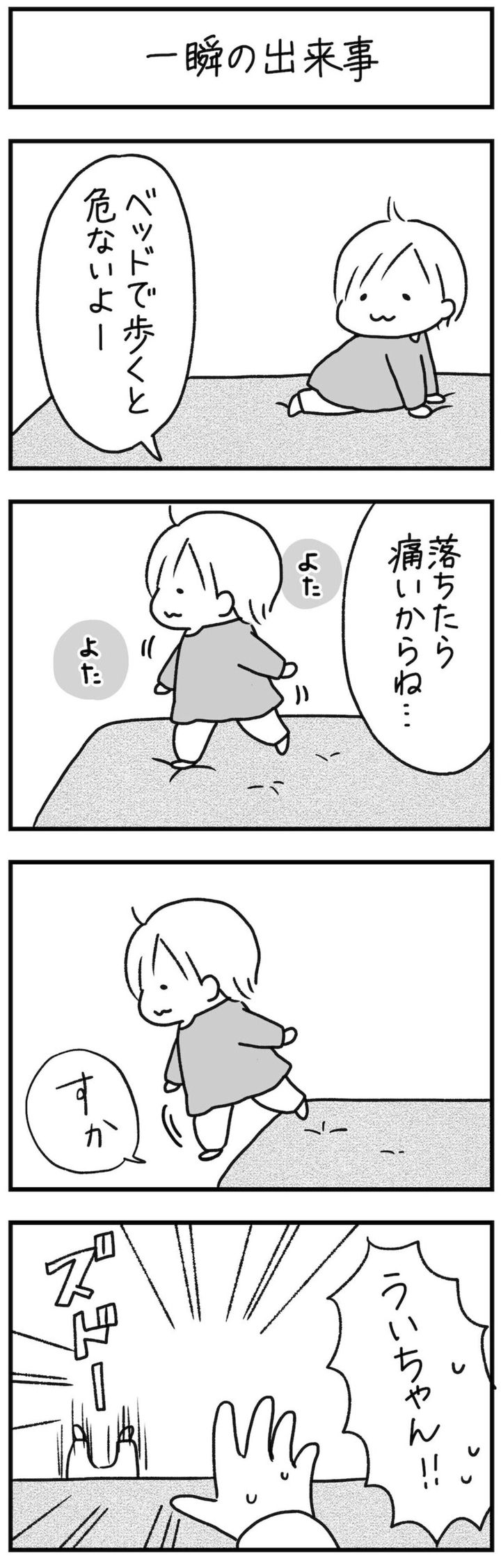 子どもはいつどんな動きをするかわかりません。しっかり見ていても子どもの思わぬ行動でケガになることも。ある日、やき子さんの娘・ういちゃんはベッドの上をよたよた歩いていました。「落ちたら痛いから危ないよ」と注意をしたやき子さんですが…?やき子さんの漫画『一瞬の出来事』をどうぞごらんください。