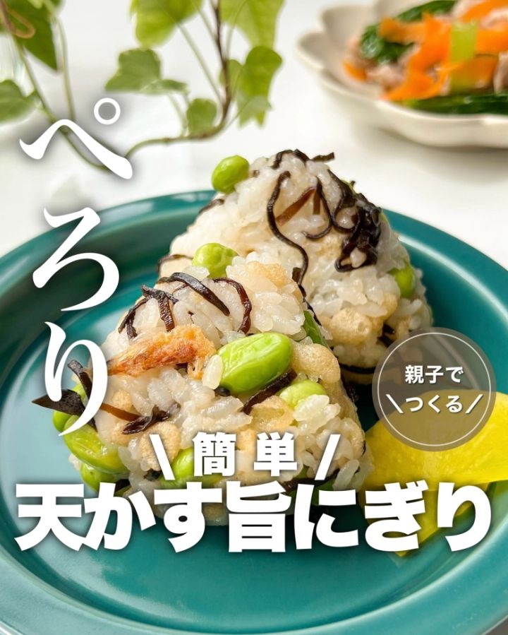 枝豆や天かすなどいろんな具材が入ったおにぎりです。しっとりジューシーな照り焼きチキンと、ポリポリザクザクとしたおにぎりをいっしょに食べれば、食感のコントラストも楽しめるはず。