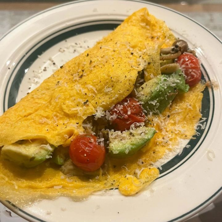 アボカドといっしょにトマトやきのこなどのお好みの野菜を塩コショウで炒め、卵で挟んだオムレツです。仕上げにブラックペッパーと削ったチーズをかけるとより華やかに♪鶏照り焼きのタレといっしょに食べてもおいしいですよ。