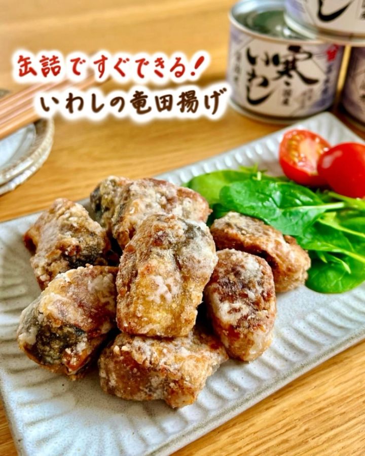 照り焼きチキンをおいしく仕上げるには、お肉を均一に広げたり片栗粉をまぶしたり、ちょっと手がかかることも。これ以上手間はかけたくないけれどもう一品欲しいときには、缶詰を使った簡単レシピがおすすめ。いわしの醤油煮はカットされていて味もついているので、片栗粉をまぶして揚げ焼きにするだけで完成です。
