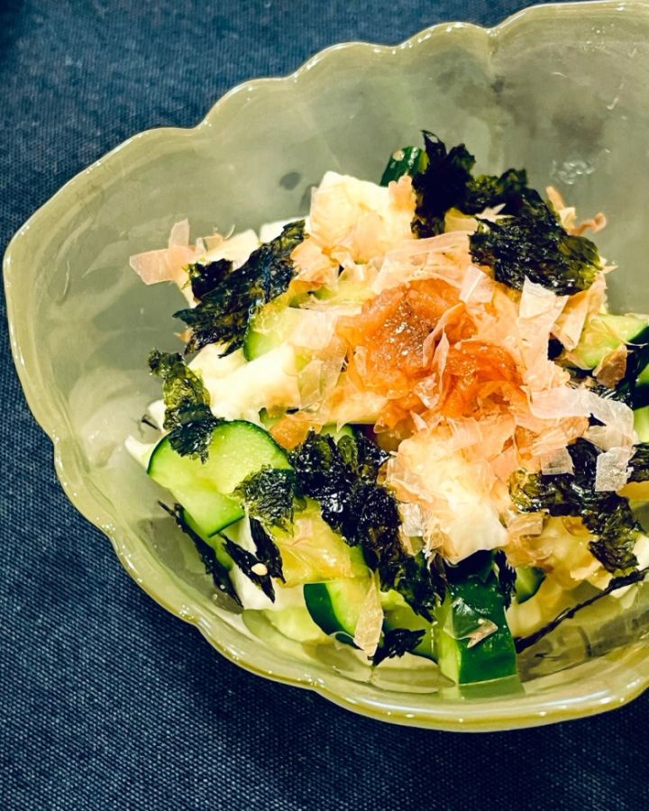 長芋ときゅうりをポン酢で和え、梅肉やかつお節、韓国のりを合わせた風味豊かな一品。照り焼きチキンでこってりした口がさっぱりしますよ。