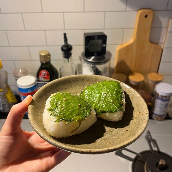 醤油とごま油、生姜といっしょに一晩漬けこんだ大葉をおにぎりにした一品です。大葉のさわやかな風味がこってりした鶏肉と相性バッチリ。