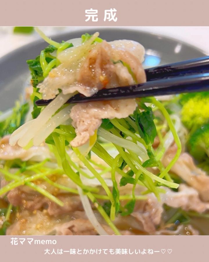 照り焼きチキンにもう一品追加したいけどカロリーが気になるというときは、野菜もたくさん食べられる蒸ししゃぶをセレクトしてみてはいかがでしょうか?耐熱皿にお好みの野菜と豚肉をのせて電子レンジで加熱するだけなので簡単ですよ。