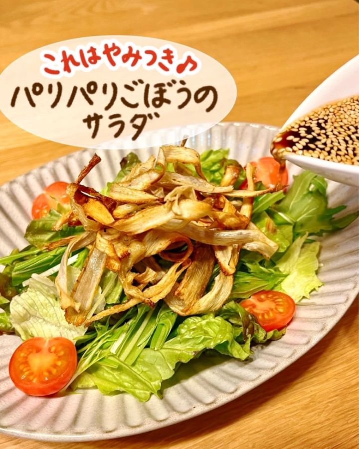 照り焼きチキンはおいしいのでうっかり食べ過ぎてしまうかも。そんなときは噛み応えがあって満足感が得やすいサラダを添えるのがおすすめです。ごぼうをピーラーで薄切りにし、こんがりきつね色に揚げ焼きすればパリパリとやみつきになる食感に♪
