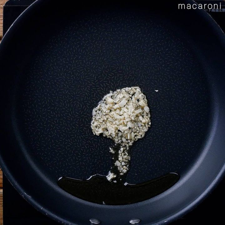 1: フライパンにごま油を熱し、にんにくを入れて弱火で炒めます。