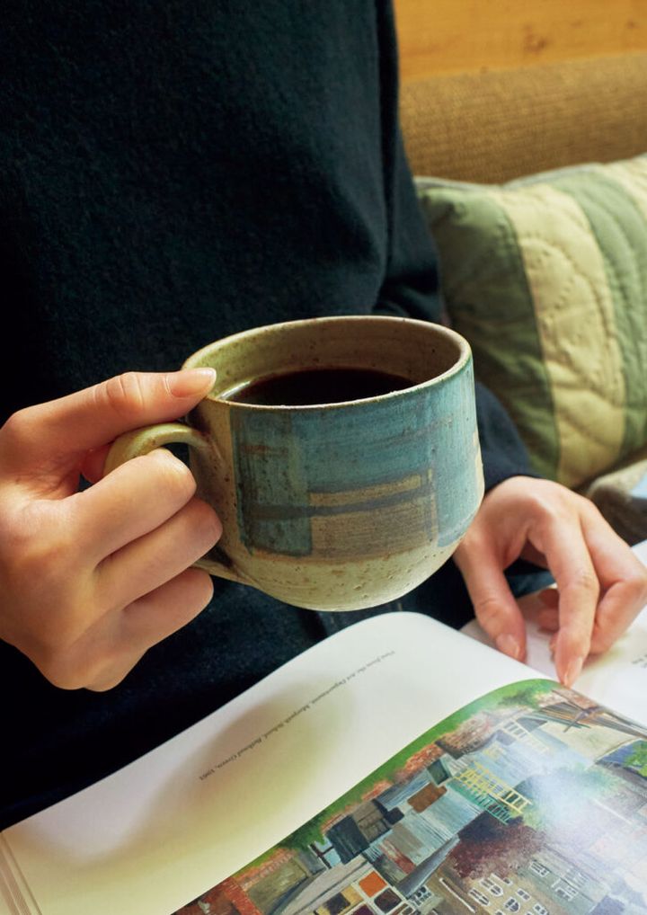 目移りしがちなマグカップだけど、国内外の作家ものが並ぶ東京・千駄ヶ谷の『GENERAL FURNISHINGS & CO.』でついに「これだ!」と思えるものを見つけた。オーストラリアの陶芸家、ソフィー・モランによる作品で、チェック柄のような模様は手描きならではの豊かな表情を放つ。静かなトーンはテーブルに馴染み、何度眺めても飽きがこない。¥7,150(ジェネラルファニシングスアンドコー 03−6432−9910) ニット¥49,500(コンテンポ/ヤエカ ホーム ストア 03−6277−1371) クッション¥38,500(以上アー・ぺー・セー キルト/アー・ぺー・セー カスタマーサービス 0120−500−990) その他スタイリスト私物