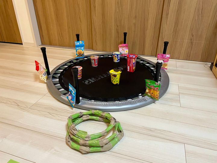子ども達が一番喜んでたくさん遊んだのが、パパ力作(?)の輪投げでした!トランポリンを裏返して、その脚に輪投げを投げるという発想に驚きつつ、お菓子をテープでくっつけて、輪投げが入ったらお菓子をゲットできるという遊び心溢れたもので、投げる距離を変えながら大人も子どもも夢中になって遊んでいました♪